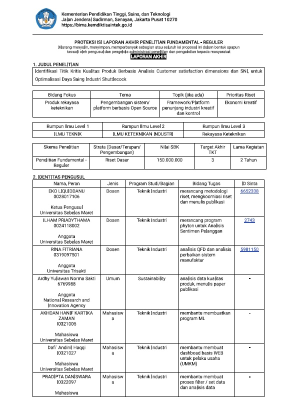 Identifikasi Titik Kritis Kualitas Produk Berbasis Analisis Customer satisfaction dimensions dan SNI untuk Optimalisasi Daya Saing Industri Shuttlecoc ...