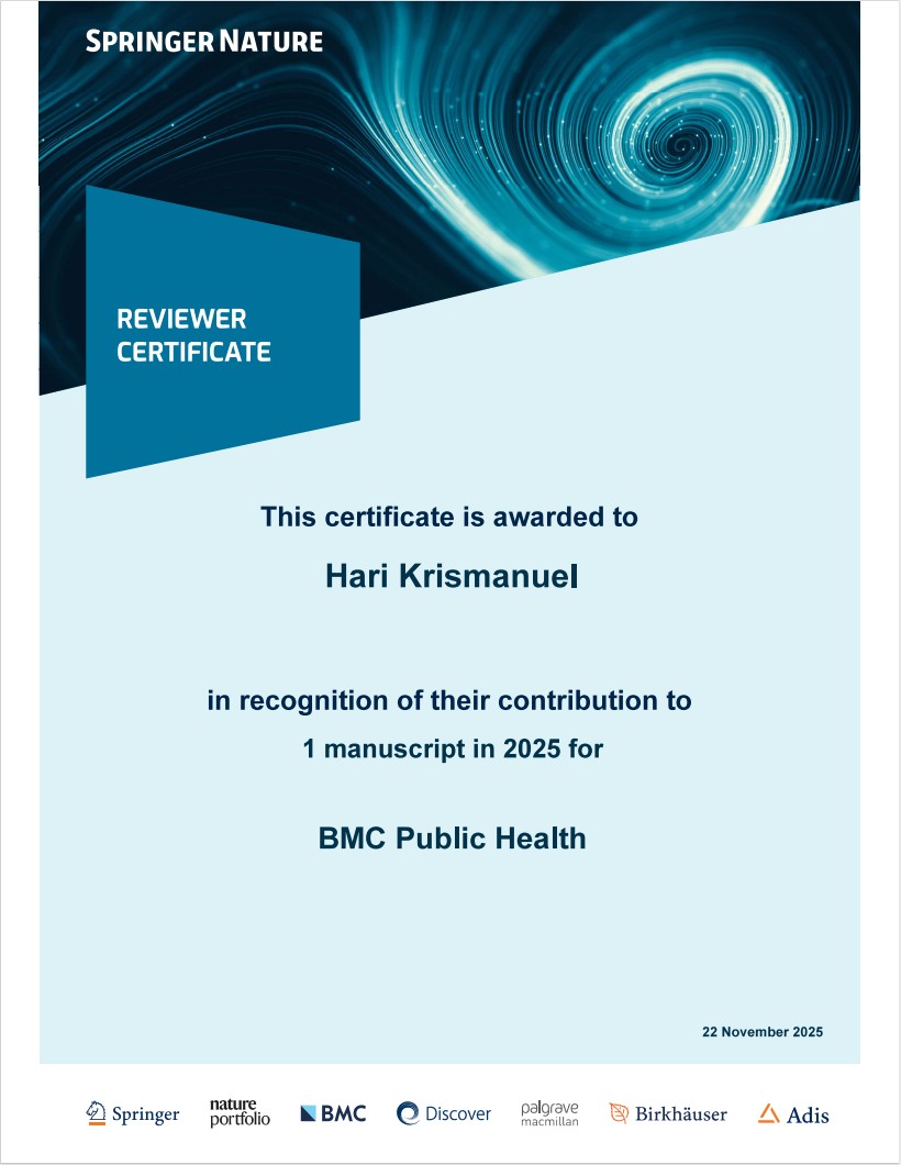 Sertifikat Reviewer dari BMC Public Health (Jurnal Q1)