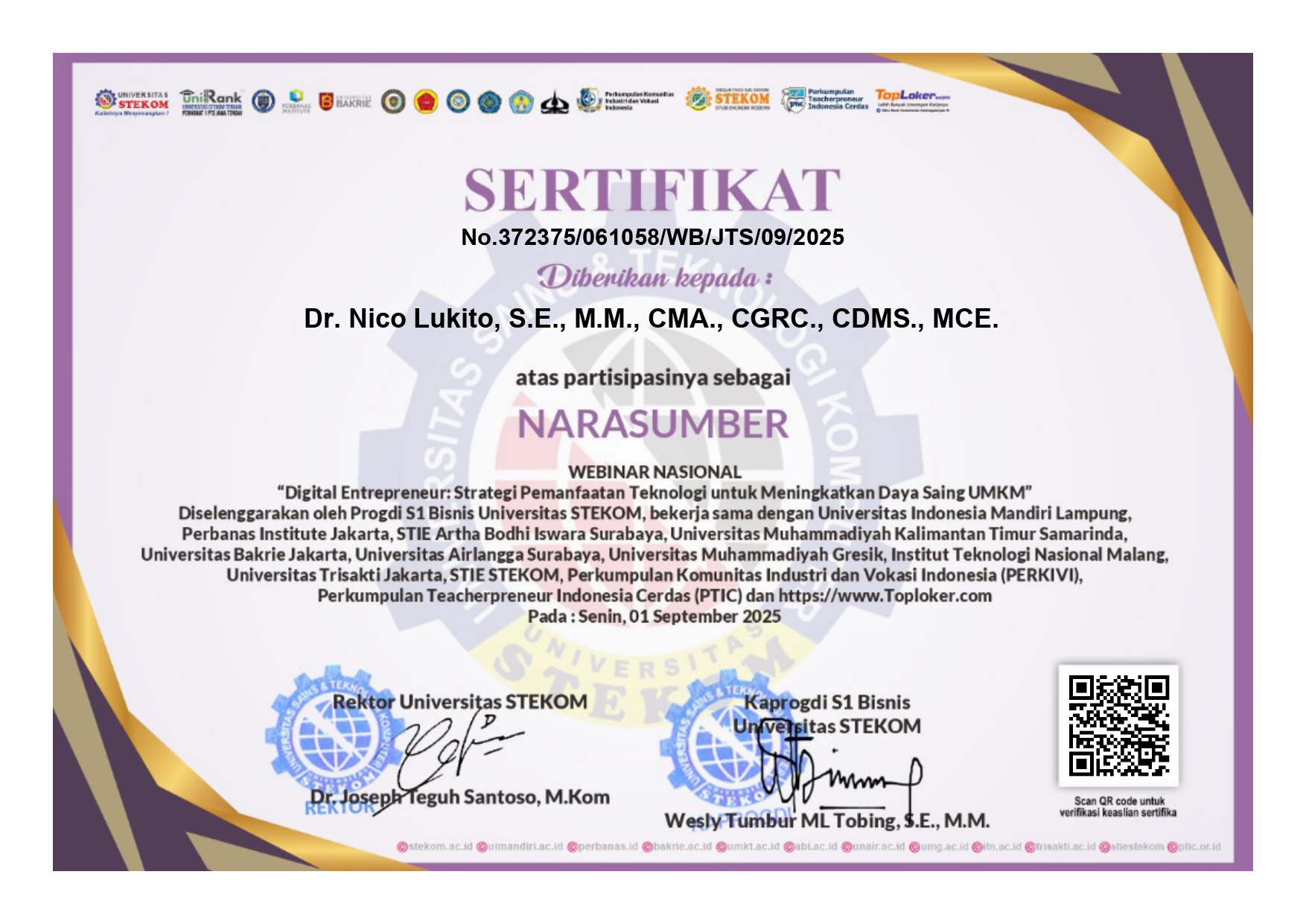 Laporan kegiatan: 1. Surat Tugas Narasumber. 2. Permohonan Narasumber Webinar. 3. Sertifikat Narasumber. 4. Materi PPT Narasumber.