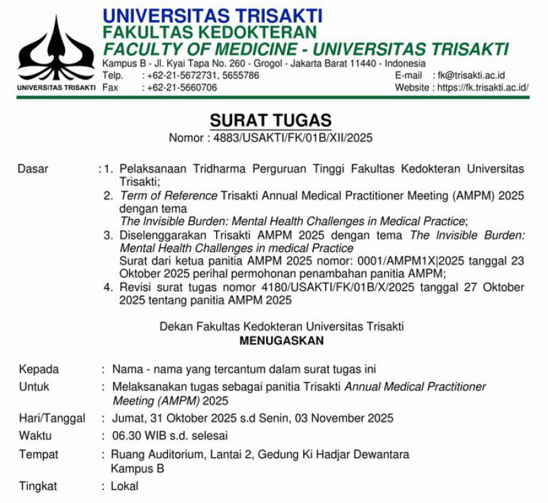 Surat tugas sebagai panitia kegiatan AMPM FK USAKTI 2025