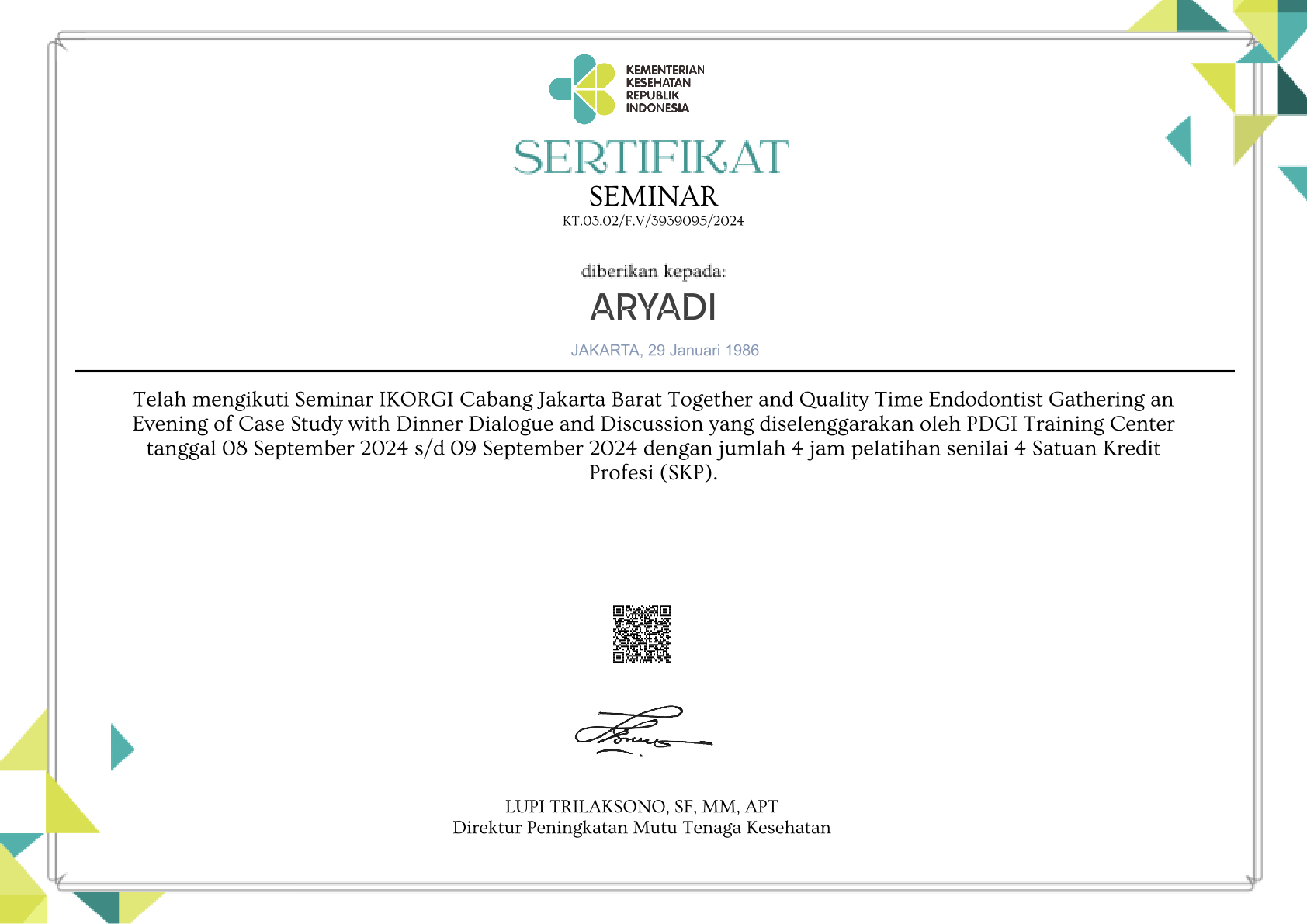 Sertifikat Seminar IKORGI Cabang Jakarta Barat Together and Quality Time Endodontist Gathering