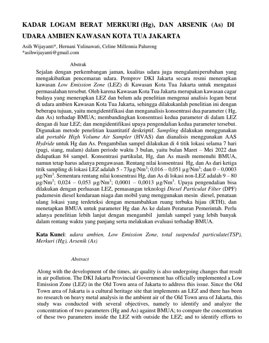 Kadar logam berat merkuri (Hg) dan Arsenik (As) di Udara Ambien Kawasan Kota Tua Jakarta
