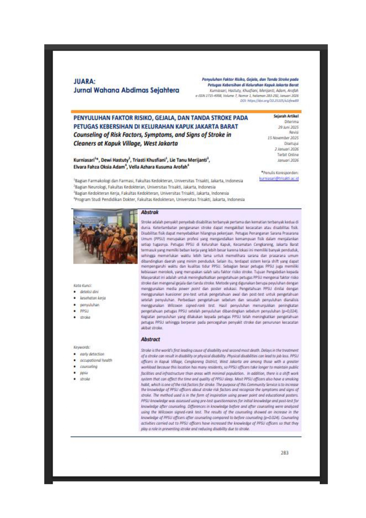 Dewi Hastuty_Publikasi Jurnal PKM_PENYULUHAN FAKTOR RISIKO, GEJALA, DAN TANDA STROKE PADA PETUGAS KEBERSIHAN DI KELURAHAN KAPUK JAKARTA BARAT_Jan 26
