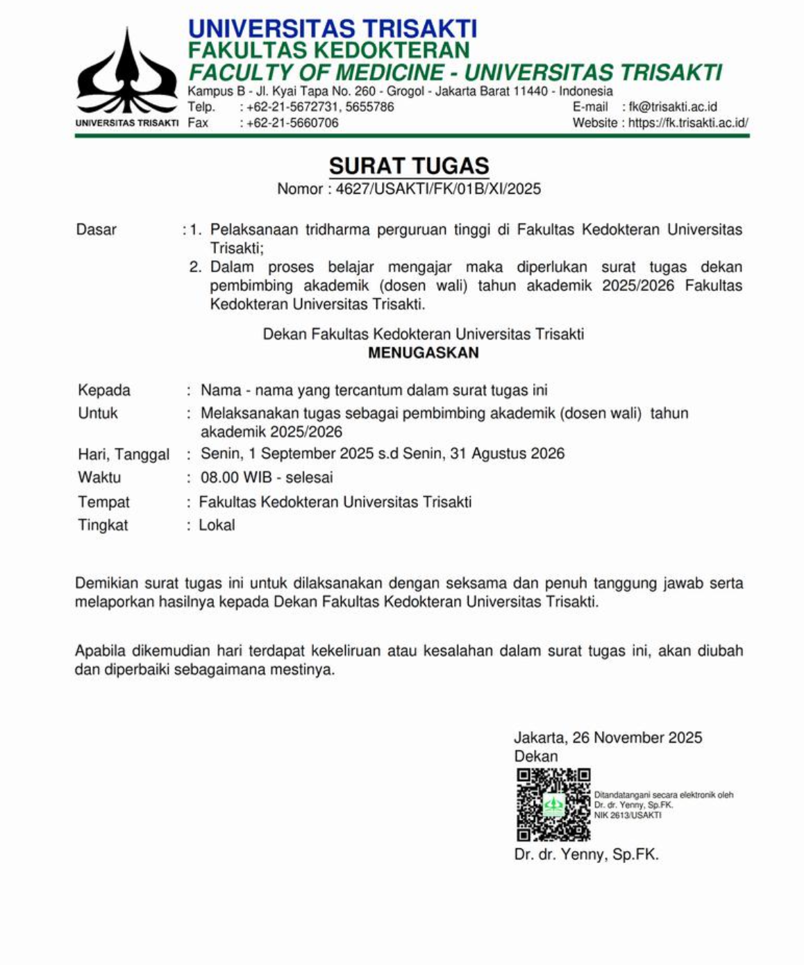 Surat Tugas Dosen Wali dr. Dita Setiati, SpA