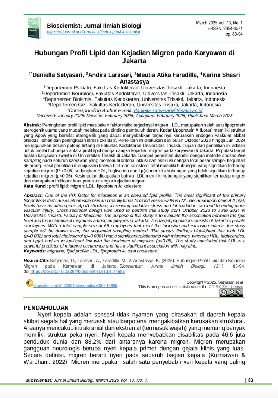 Hubungan Profil Lipid dan Kejadian Migren pada Karyawan di Jakarta