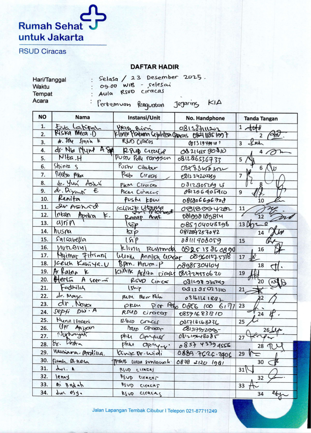 Daftar Hadir Acara Rapat Penguatan Jejaring KIA di Kecamatan Ciracas Jakarta Timur