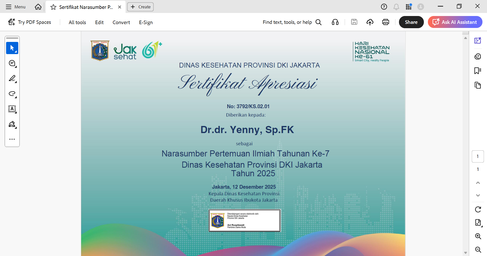 Sertifikat Narasumber Pertemuan Ilmiah Tahunan Ke 7 Dinas Kesehatan 2025