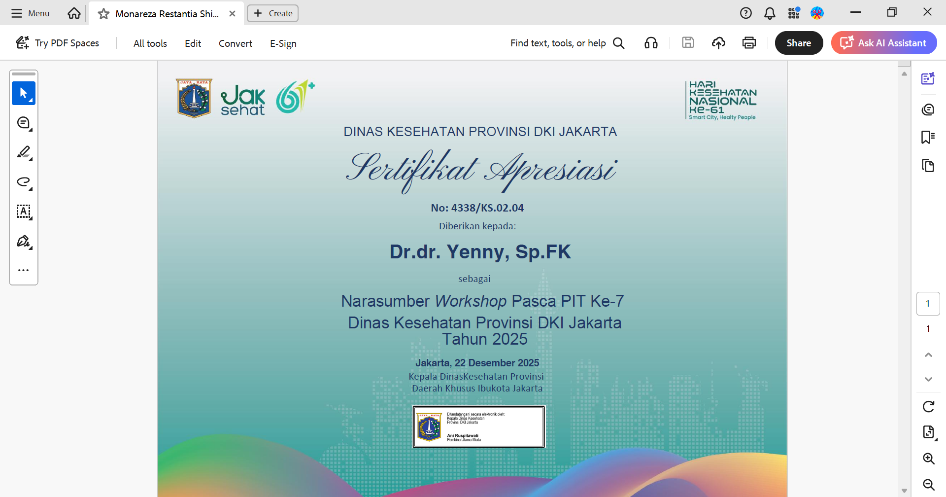 Sertifikat Narasumber Workshop Pasca PIT Ke 7 Dinas Kesehatan 2025
