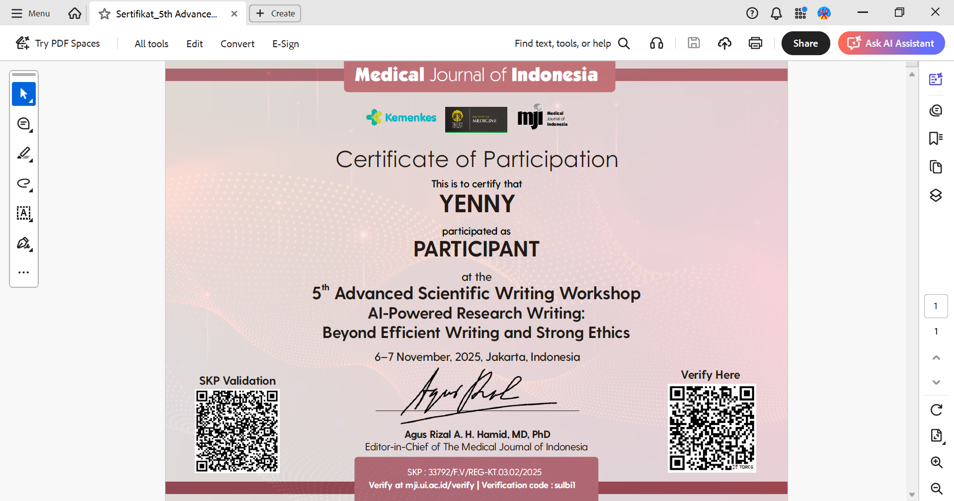 Sertifikat workshop MJI the Sth advanced scientific writing workshop