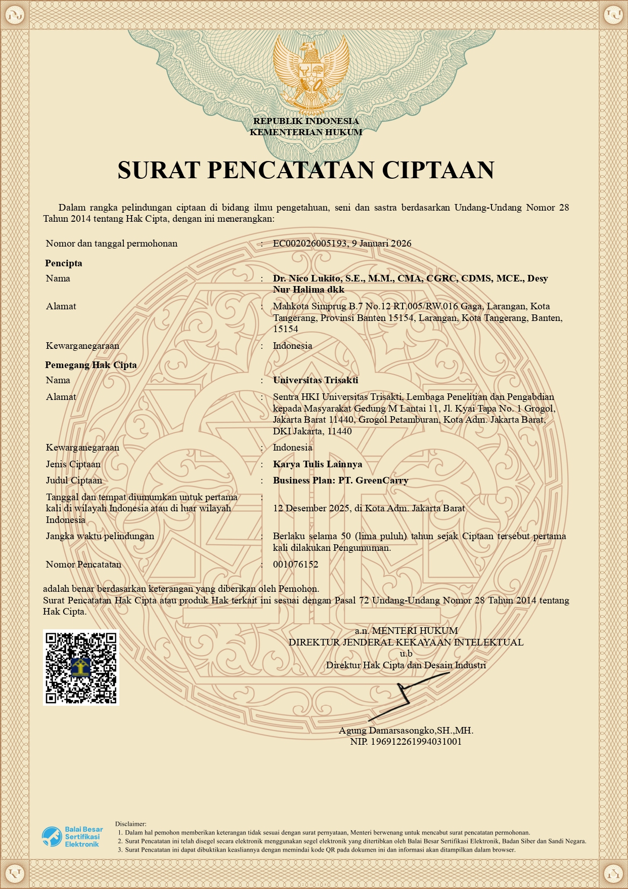 EC002026005193, 9 Januari 2026 Dr. Nico Lukito, S.E., M.M., CMA,CGRC, CDMS, MCE. Desy Nur Halima Alya Khoirunnisa Monika Teresia Silitonga
