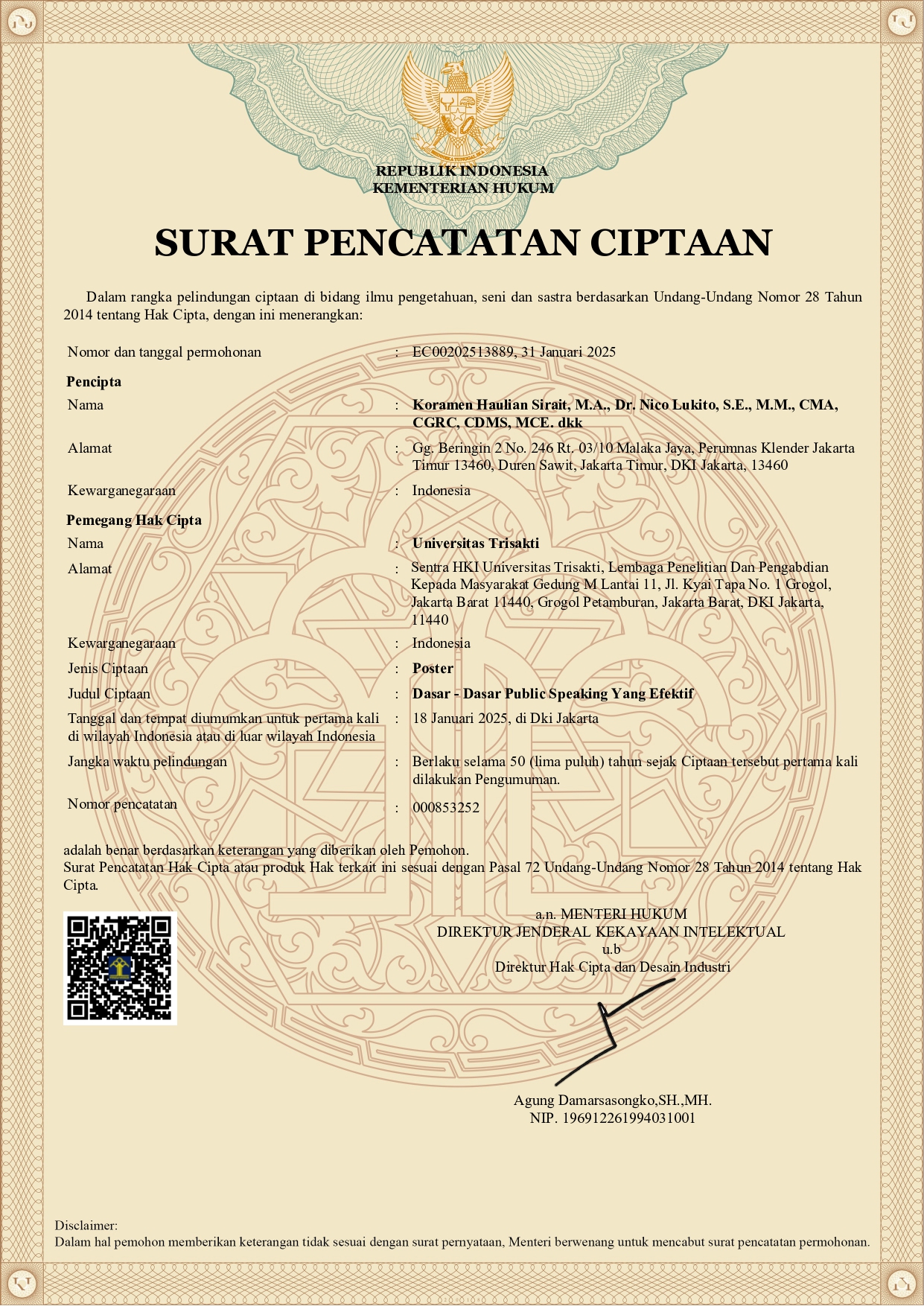 EC00202513889, 31 Januari 2025 Koramen Haulian Sirait, M.A. Dr. Nico Lukito, S.E., M.M., CMA, CGRC, CDMS, MCE. Dr. Lydia Rosintan, M.Si, GRCE Dr. Agustina Suparyati, S.E., M.E.