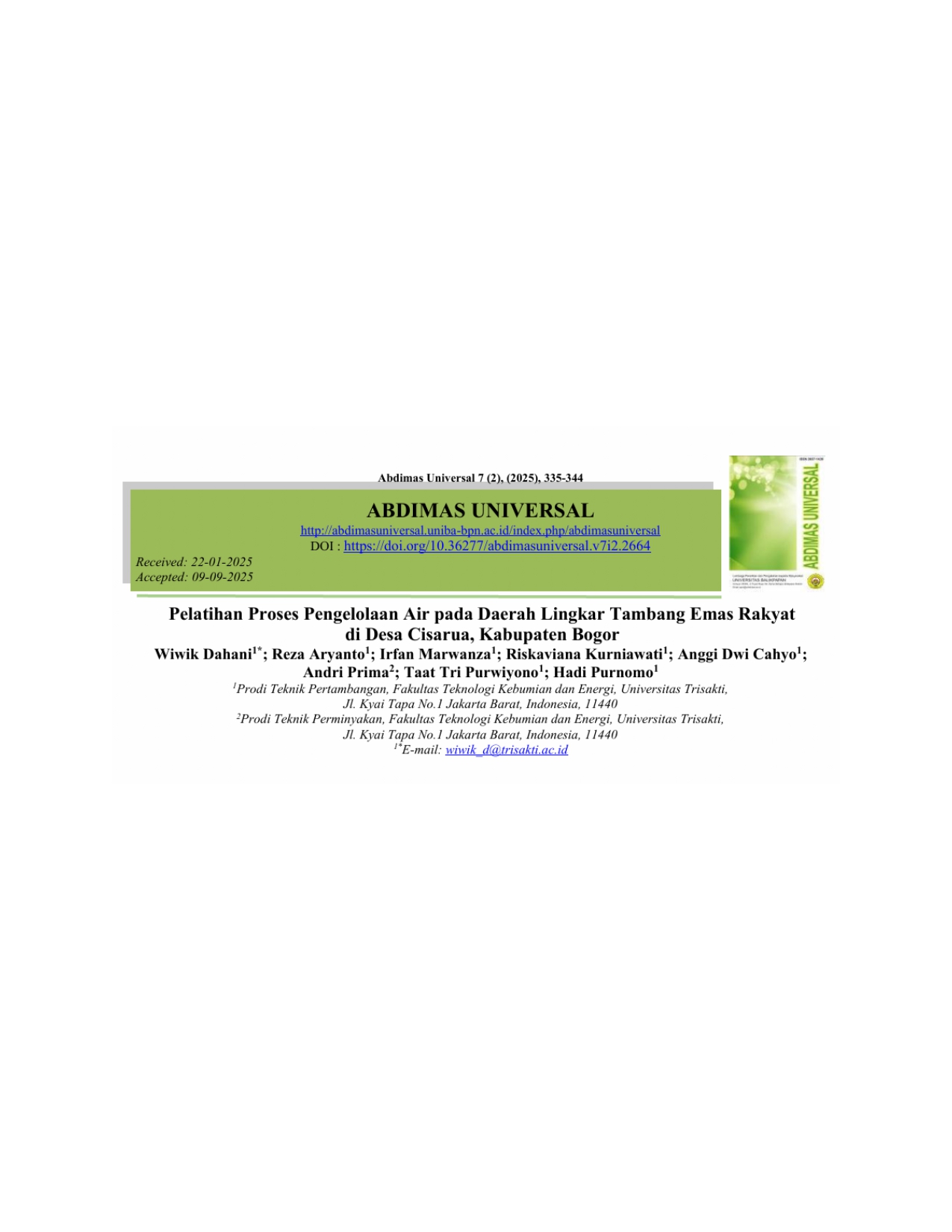 Dokumen lengkap: Pelatihan Proses Pengelolaan Air pada Daerah Lingkar Tambang Emas Rakyat di Desa Cisarua, Kab Bogor