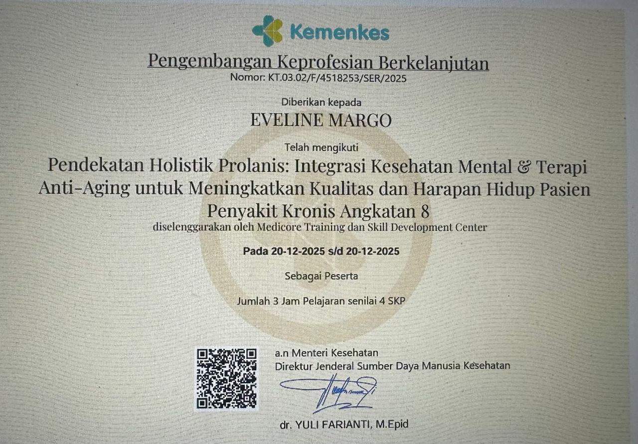 Eveline_sertifikat Pendekatan Holistik Prolanis: Integrasi Kesehatan Mental & Terapi Anti-Aging untuk Meningkatkan Kualitas dan Harapan Hidup Pasien Penyakit Kronis