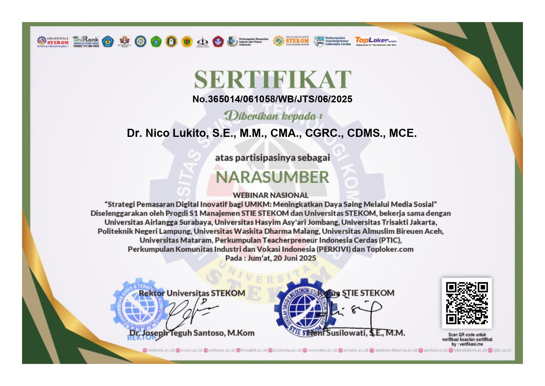 Laporan Kegiatan: 1. Surat Tugas Narasumbert 20 Juni 2025. 2. Permohonan Narasumber. 3. Sertifikat Narasumber. 4. Materi PPT Narasumber.