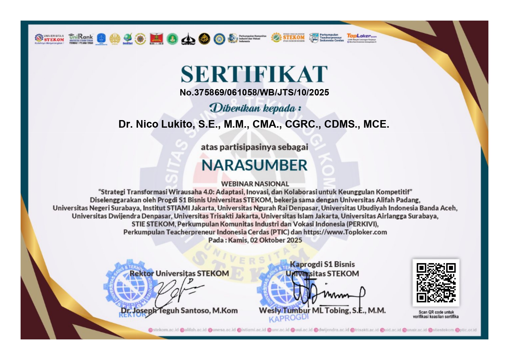 Laporan Kegiatan: 1. Surat Tugas Narasumber. 2. Permohonan Narasumber Webinar. 3. Sertifikat Narasumber. 4. Materi PPT Narasumber.