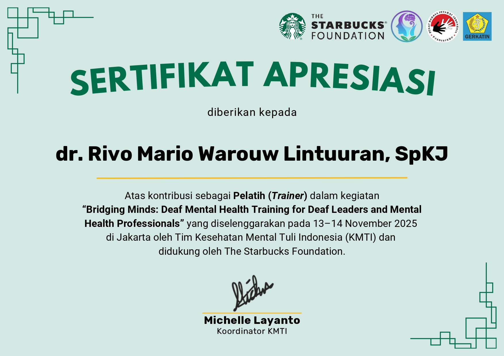 Sertifikat Trainer Pelatihan Kesehatan Mental Tuli