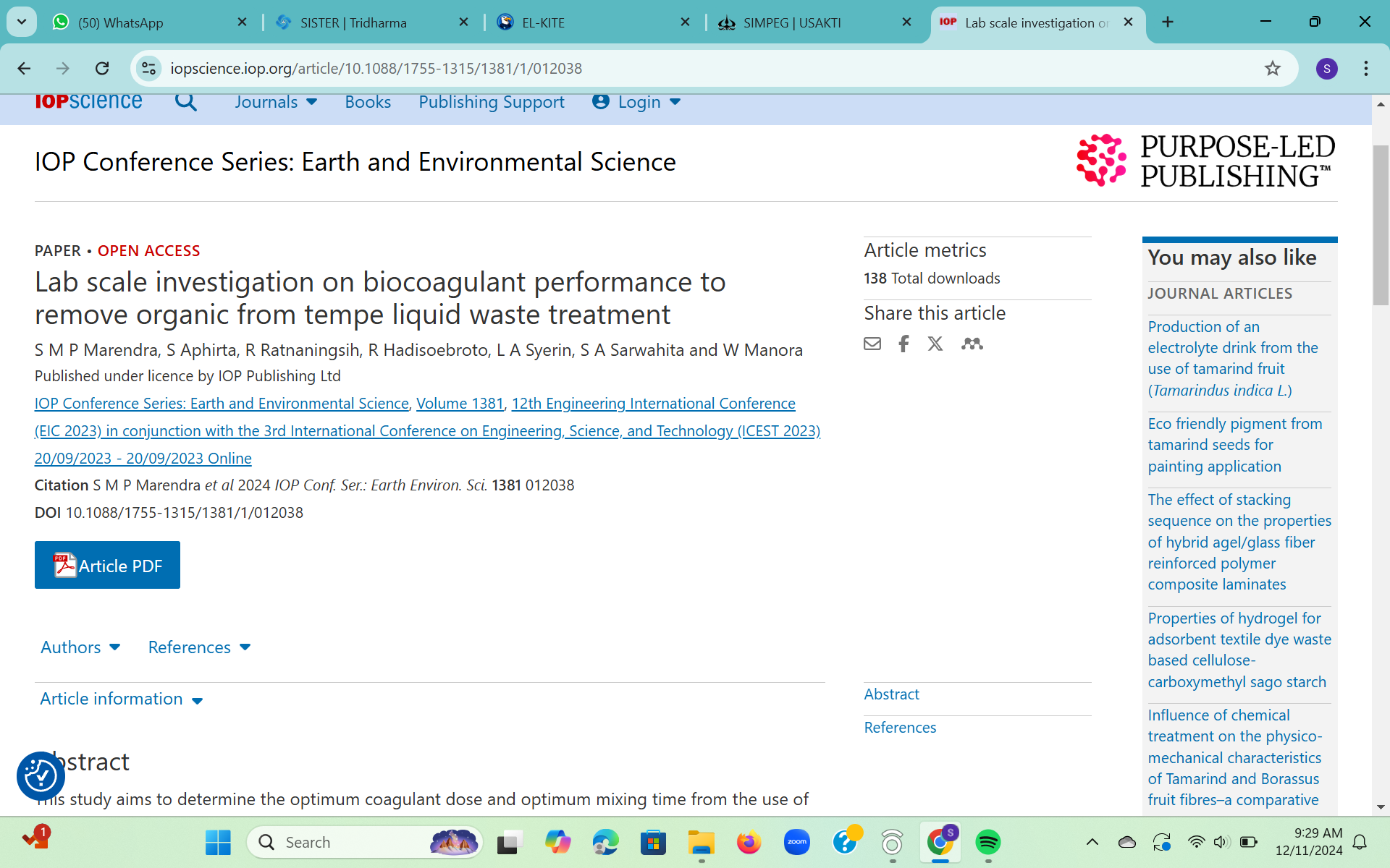 Lab scale investigation on biocoagulant performance to remove organic from tempe liquid waste treatment_sheilla