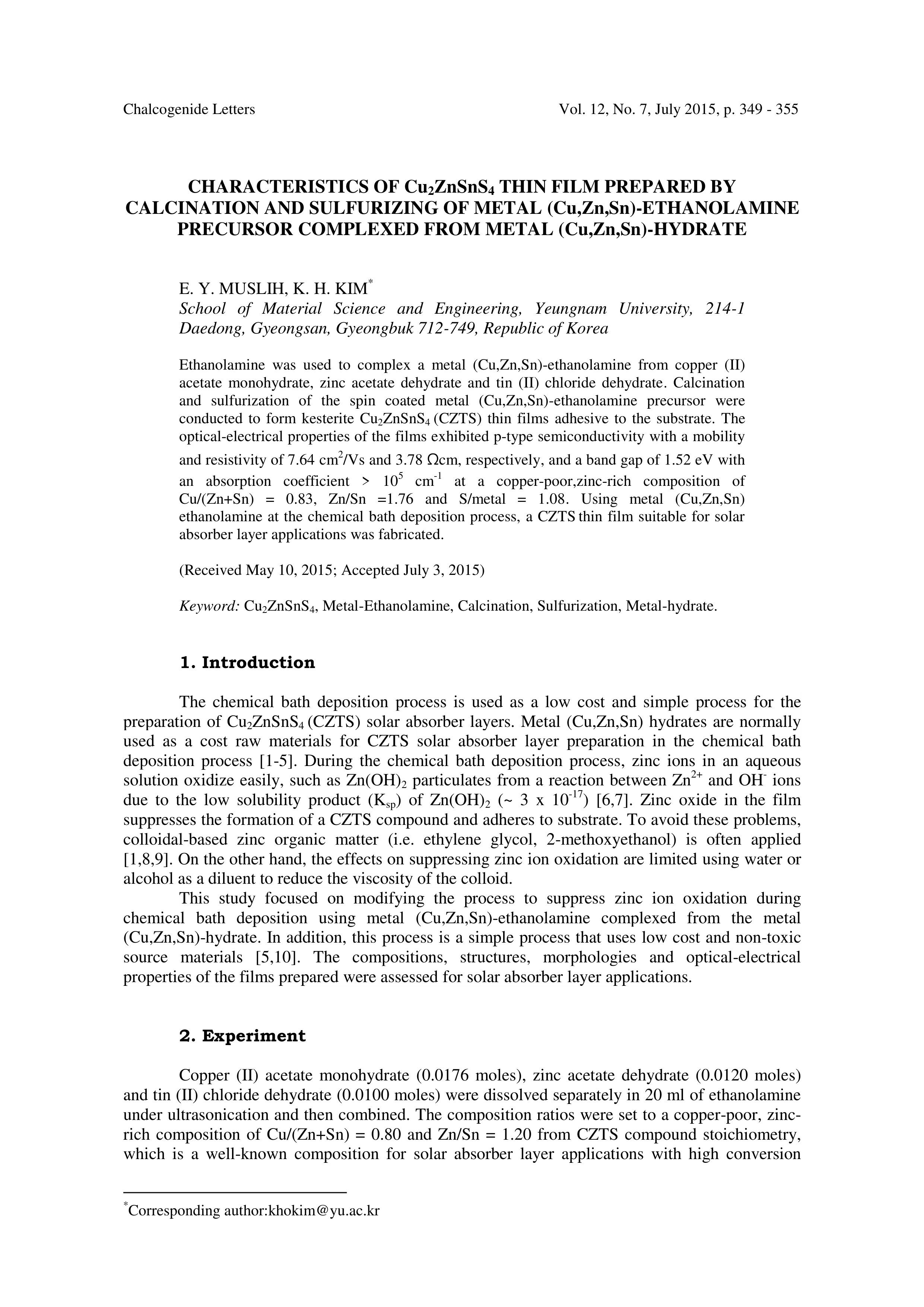 Plagiarisme Cek dari jurnal yang berjudul Characteristics of Cu2ZnSnS4 thin film prepared by calcination and sulfurizing of metal (Cu, Zn, Sn)-ethanolamine precursor complexed from metal (Cu, Zn, Sn)-hydrate