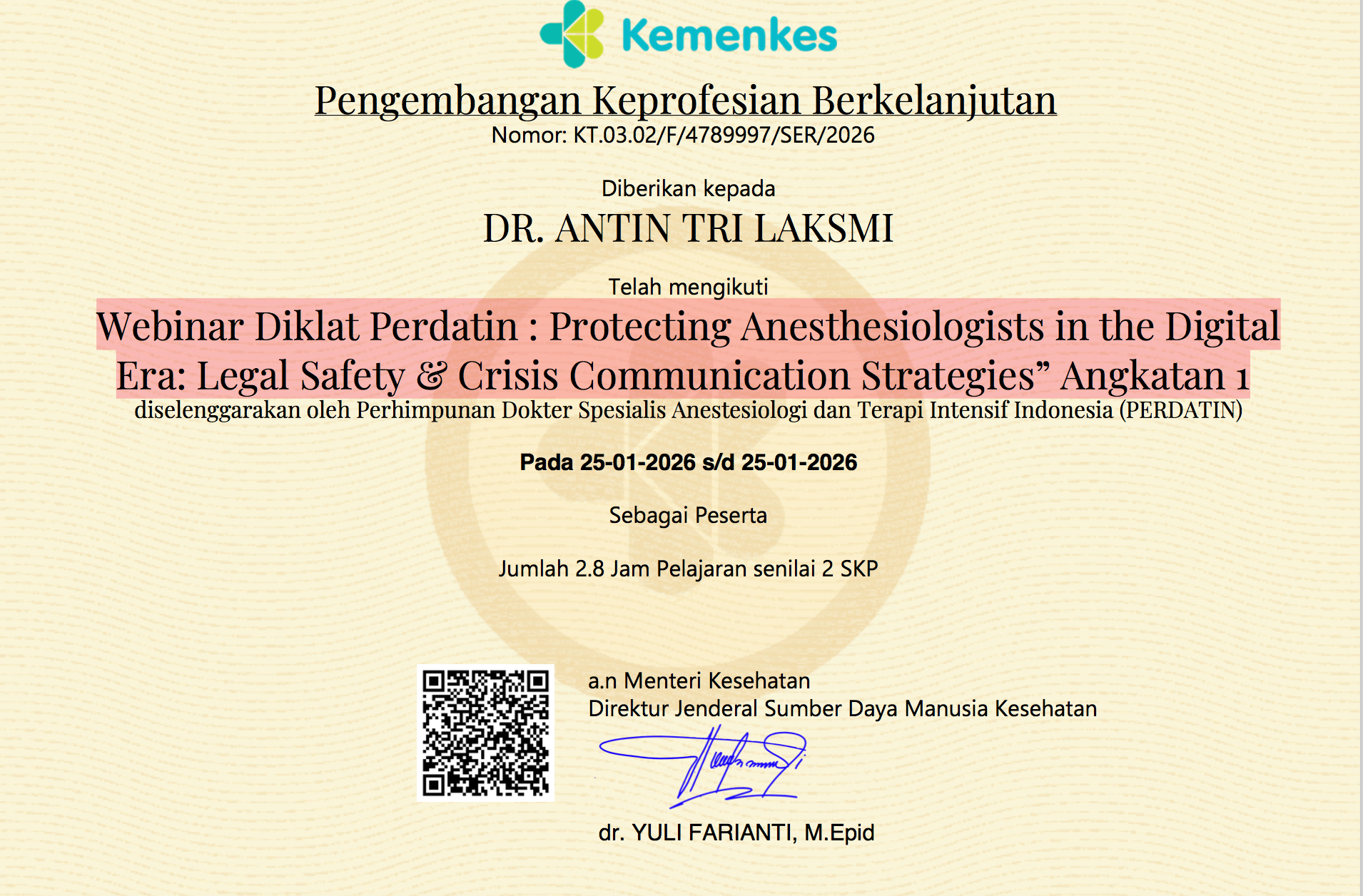 Webinar Diklat Perdatin : Protecting Anesthesiologists in the Digital Era: Legal Safety & Crisis Communication Strategies” Angkatan 1 ...