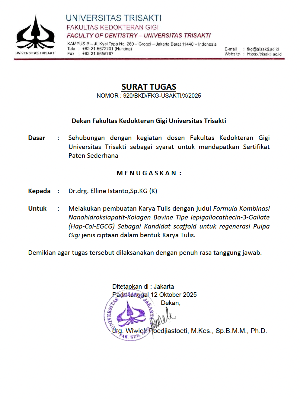 Surat Tugas Dekan Nomor : 4627/USAKTI/FK/01B/XI/2025 tertanggal 26 November 2025 ...