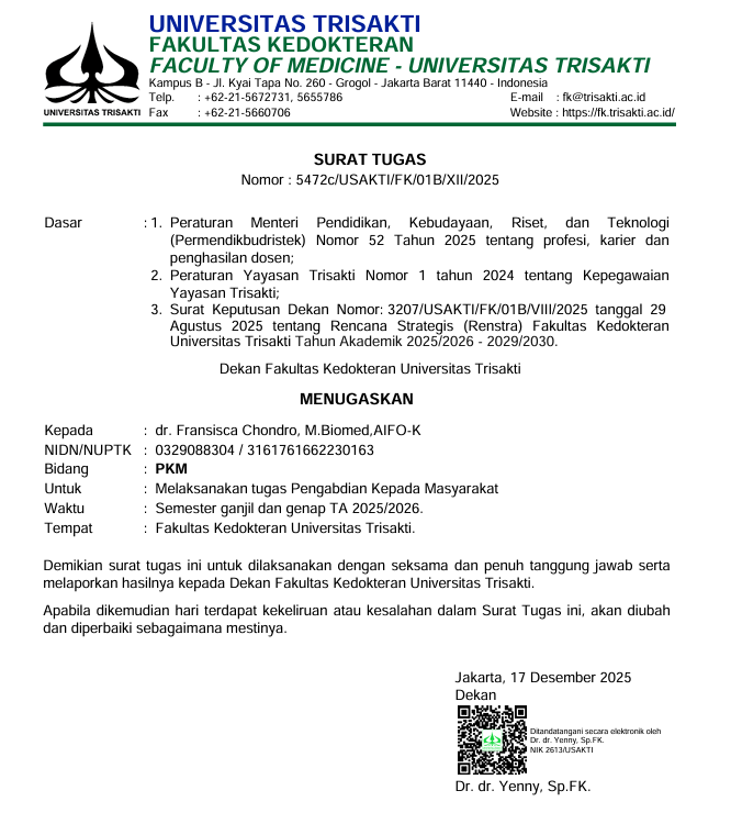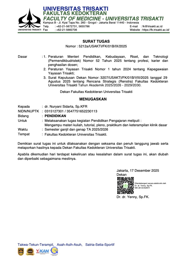 Surat Tugas Dekan Bidang Pendidikan Nomor : 5212a/USAKTI/FK/01B/IX/2025 tertanggal 17 Desember 2025 ...
