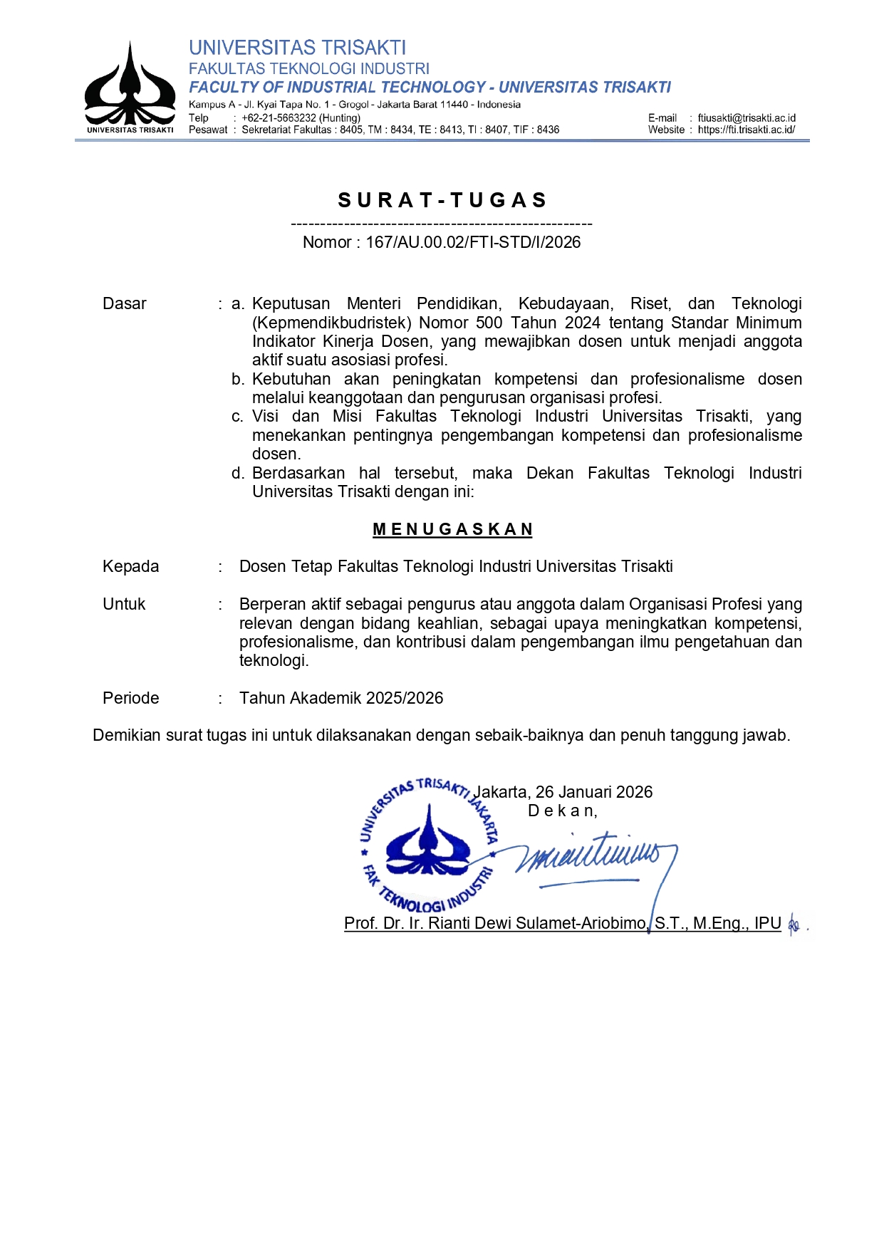 Surat Tugas Dekan Bidang Pendidikan Nomor : 5212c/USAKTI/FK/01B/IX/2025 tertanggal 17 Desember 2025 ...
