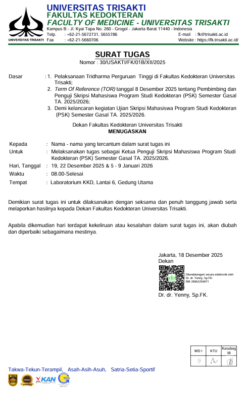 Surat Tugas Dekan Nomor : 30/USAKTI/FK/01B/XII/2025 tertanggal 18 Desember 2025 ...