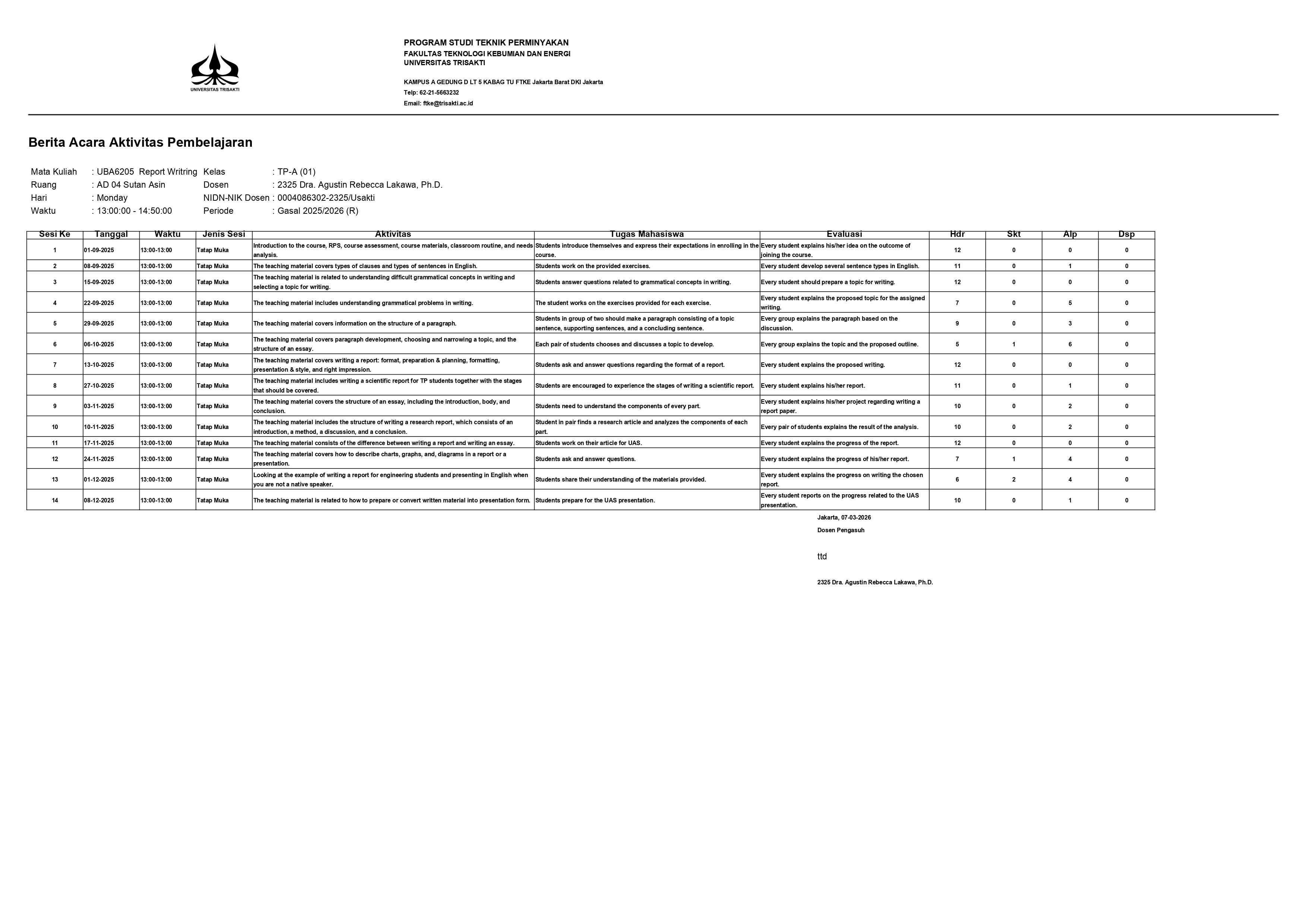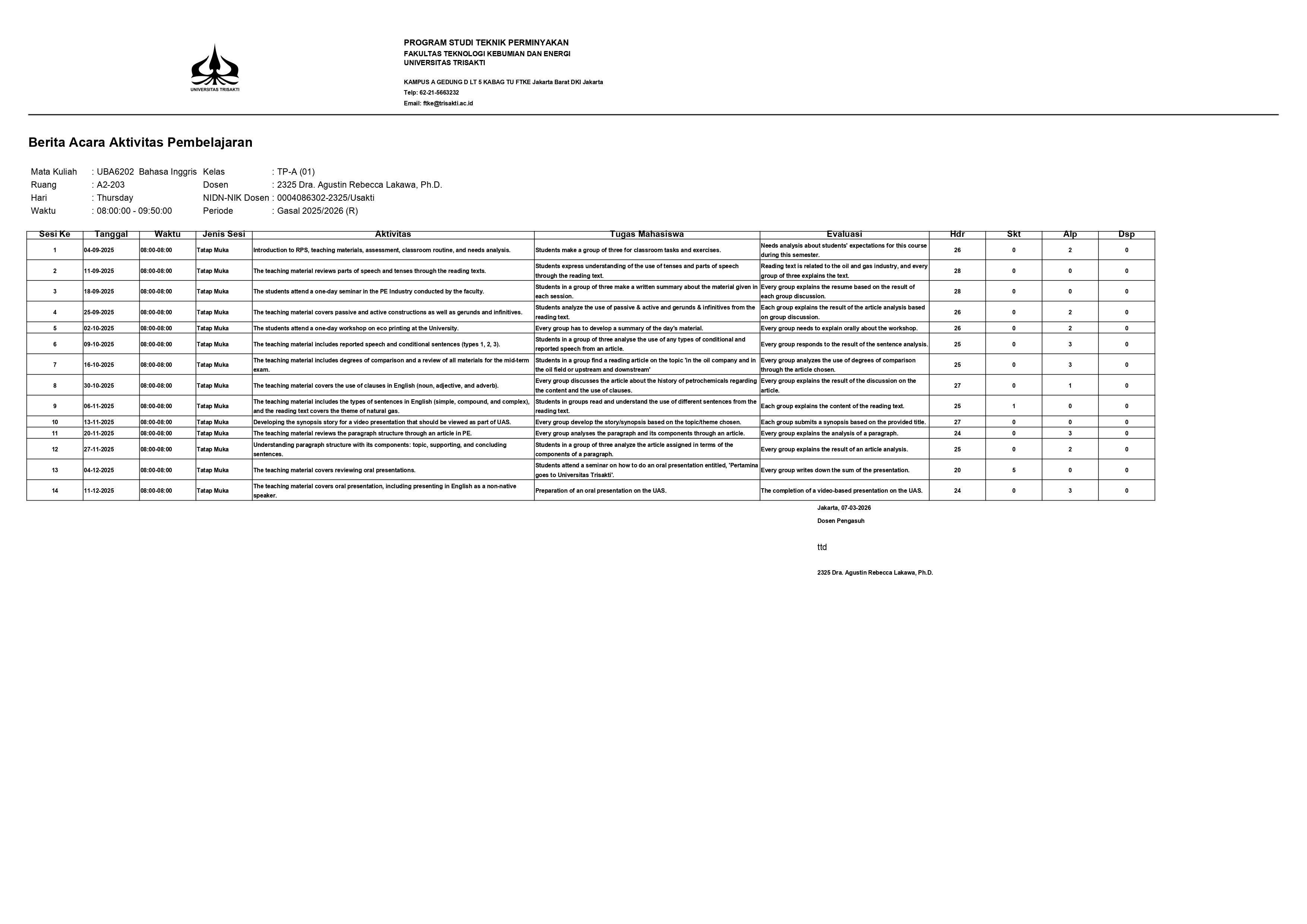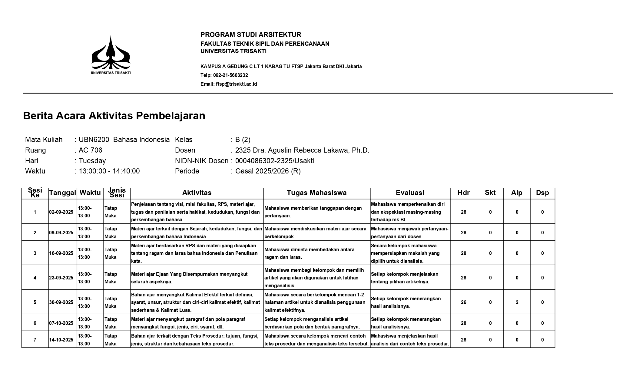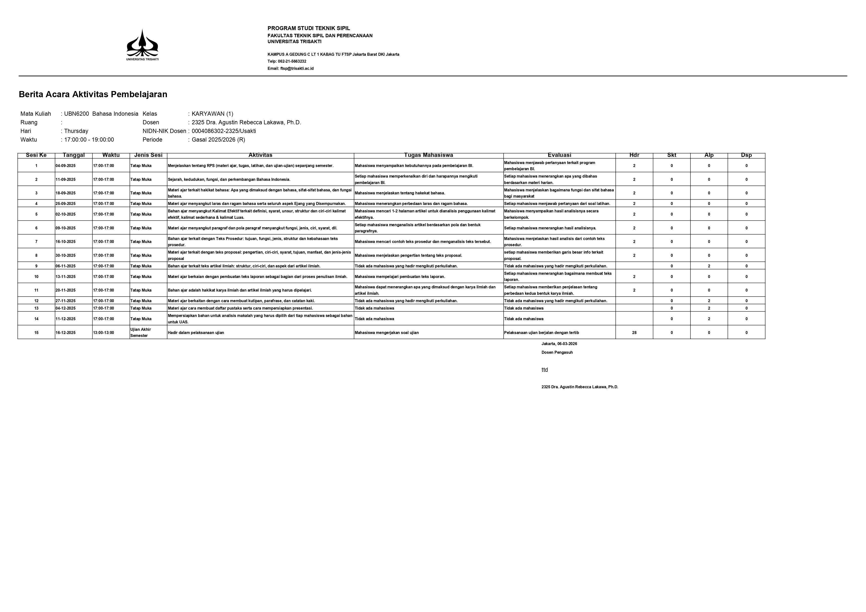 Bundel Mengajar MK Bahasa Indonesia Kelas Karyawan pada Prodi Teknik Sipil Semester Gasal 2025-2026 terdiri atas BAP, Daftar hadir, dan Daftar Nilai. ...