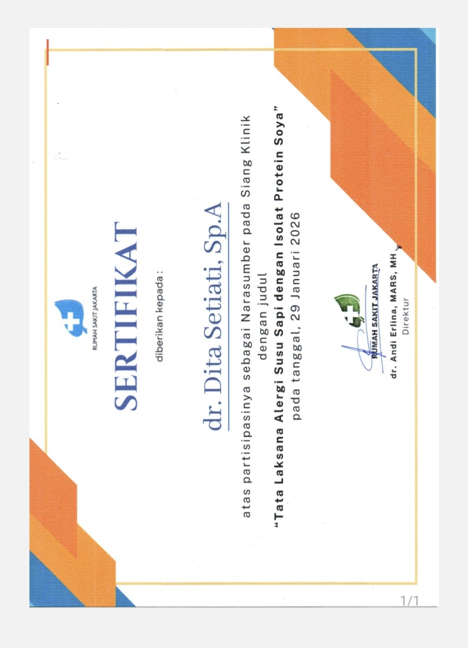 Dita Setiati_Sertifikat Pembicara Siang Klinik RS Jakarta : Tatalaksana ASS dengan Isolat Protein Soya ...