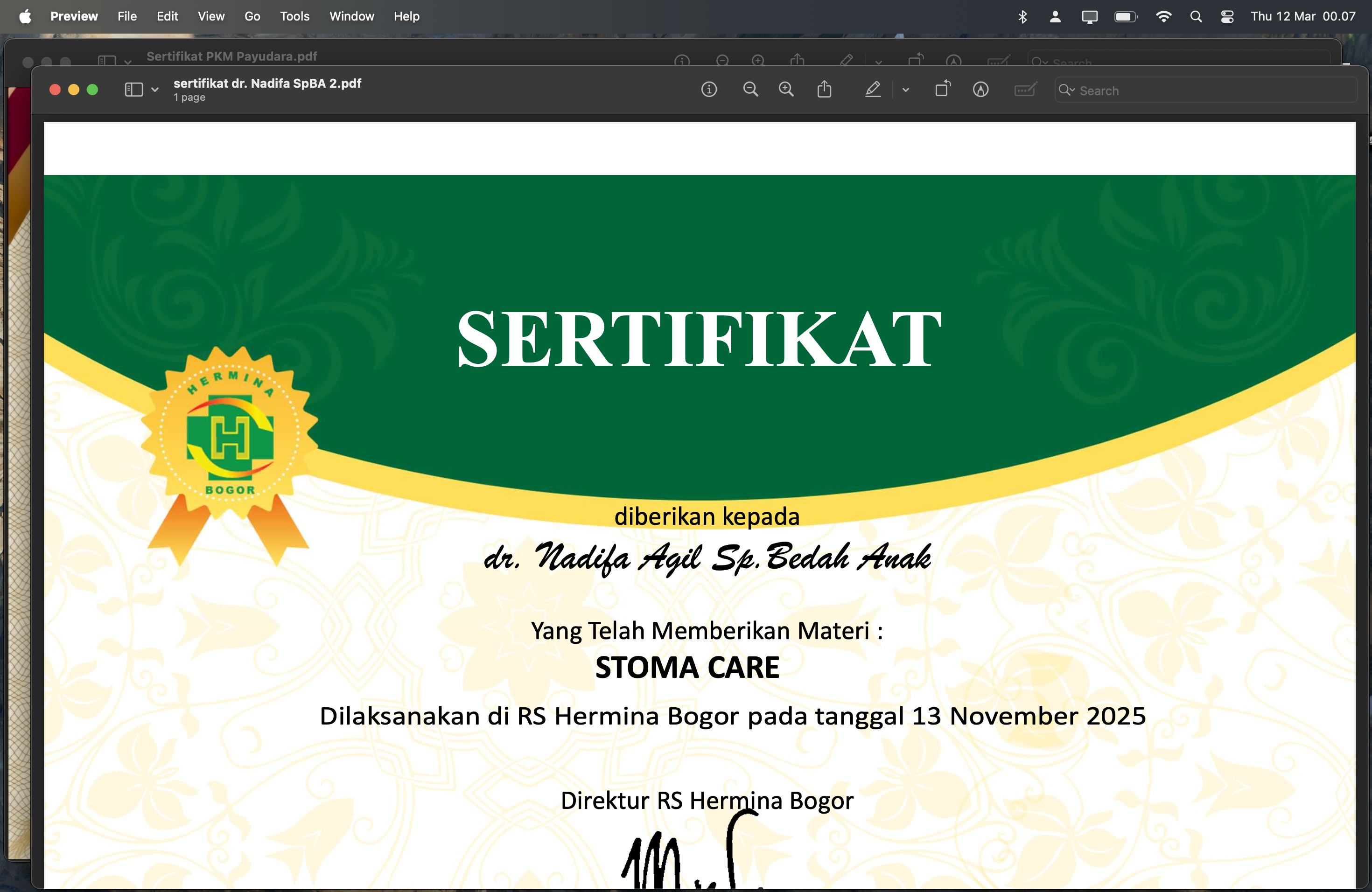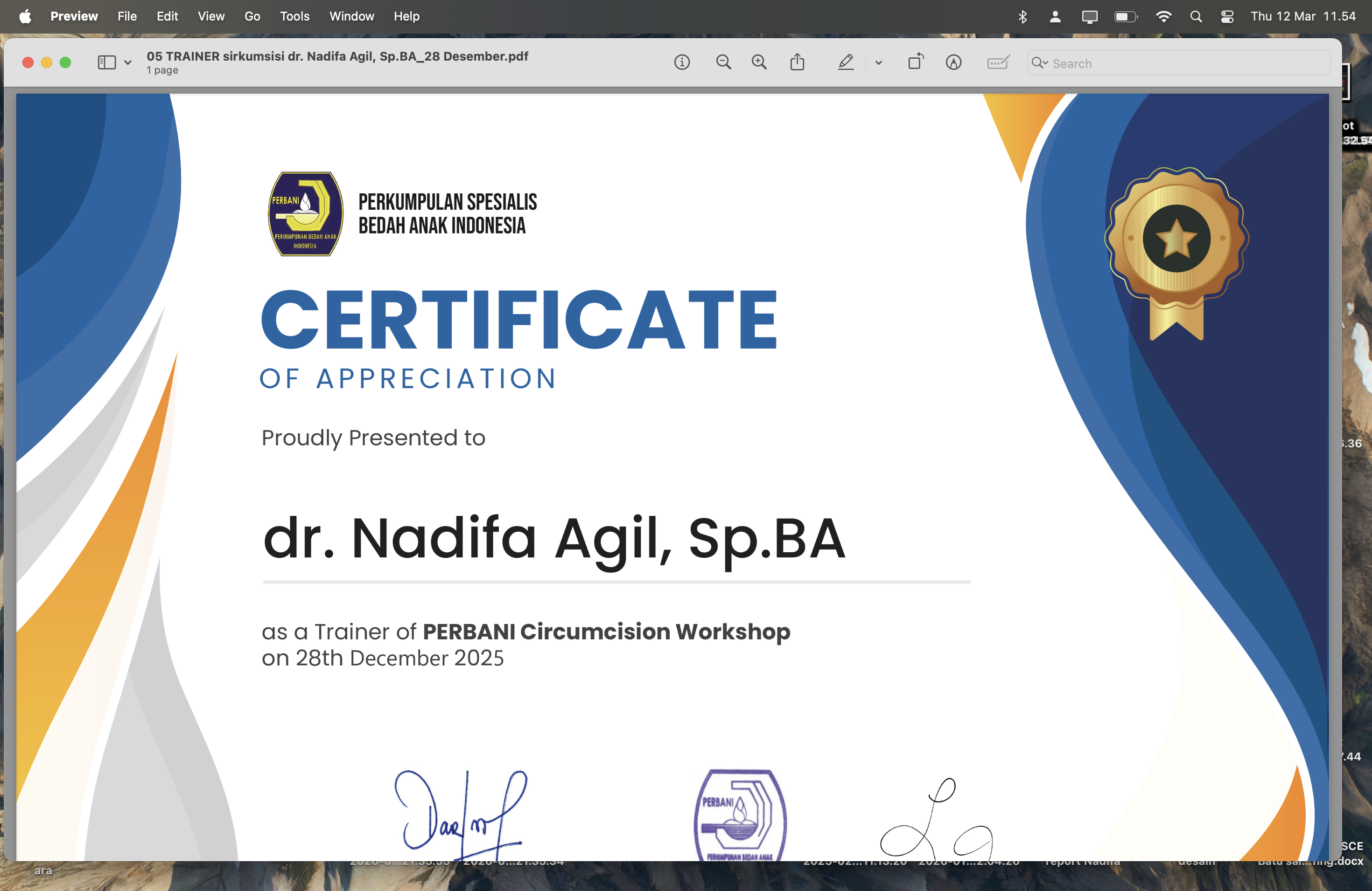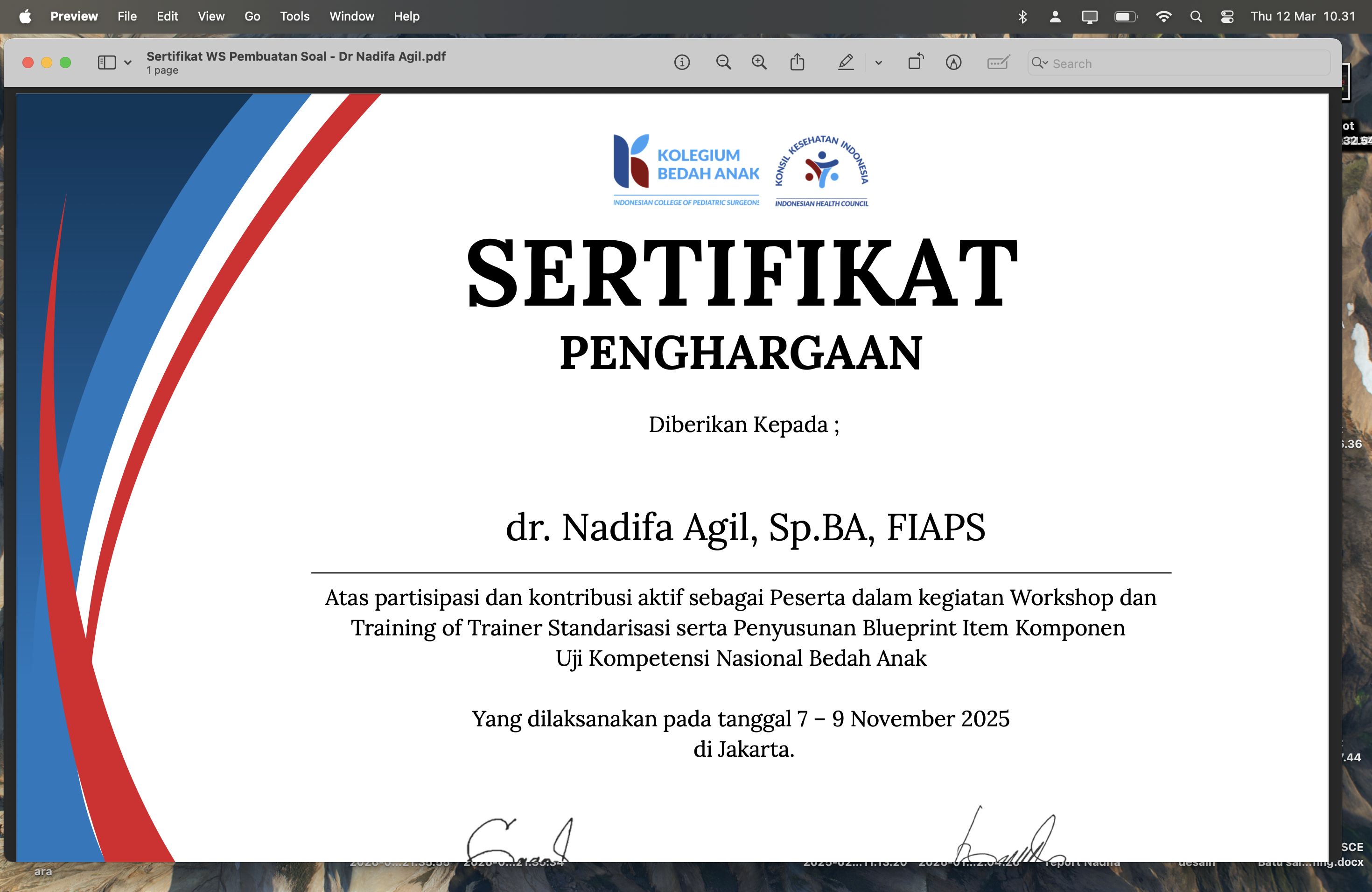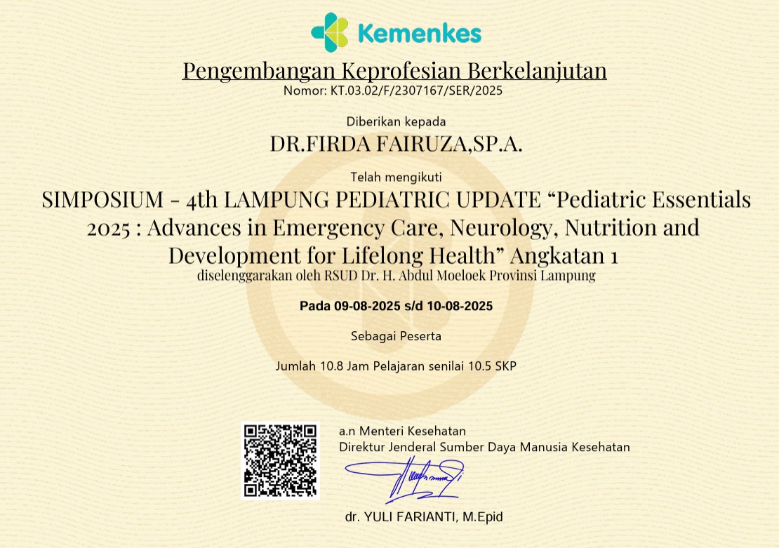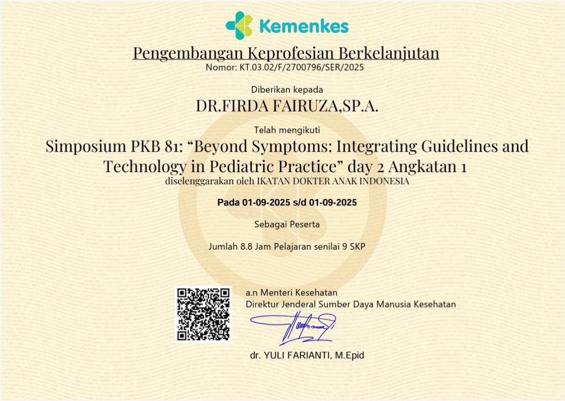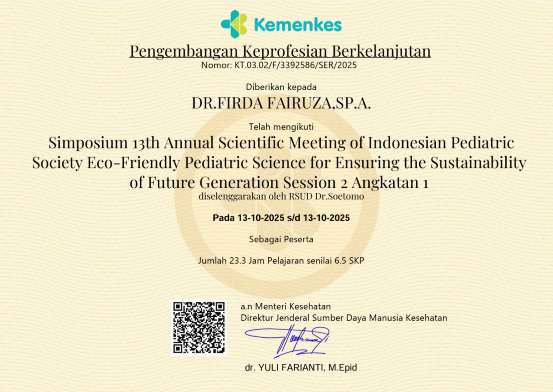 Sertifikat Simposium 13th Annual Scientific Meeting of Indonesian Pediatric Society Eco-Friendly Pediatric Science for Ensuring the Sustainability of Future Generation Session 2 Angkatan 1