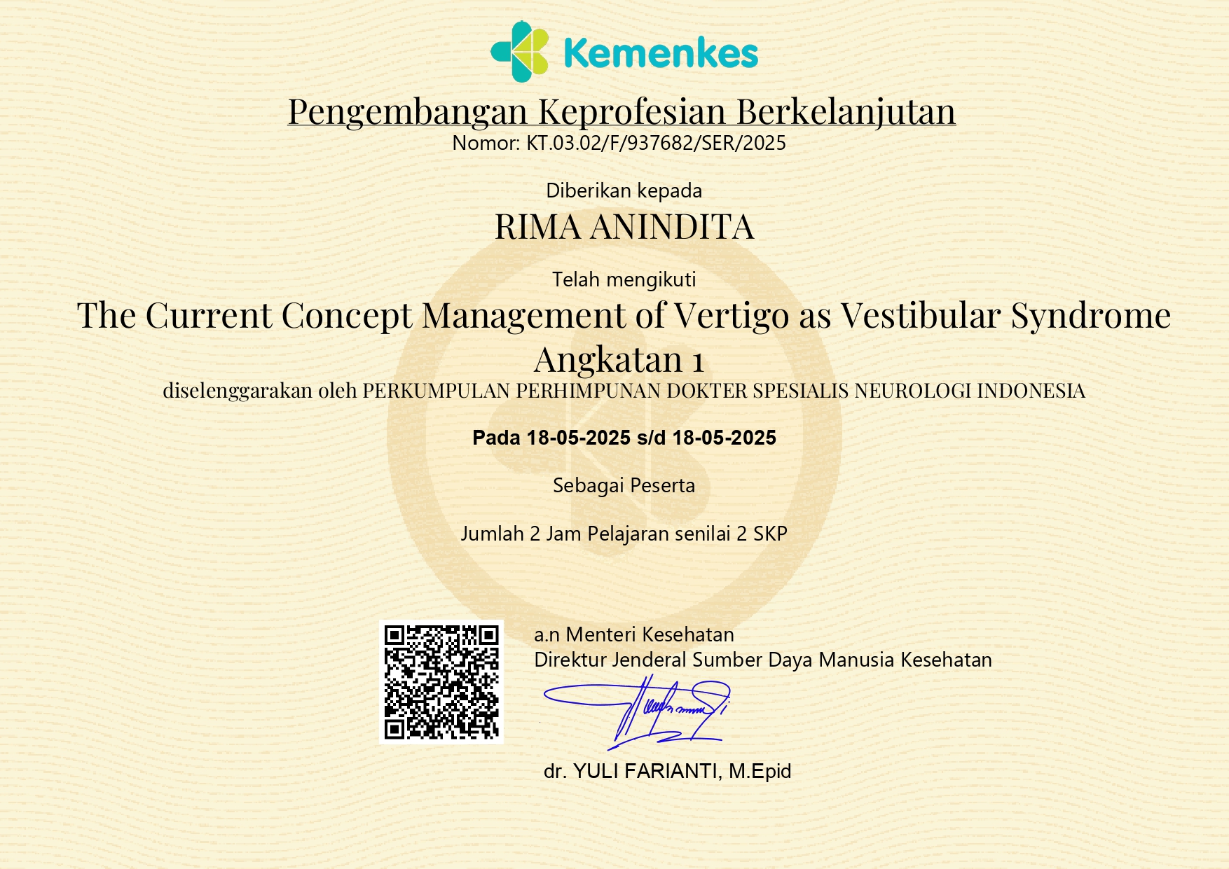 SERTIFIKAT THE CURRENT CONCEPT MANAGEMENT OF VERTIGO S VESTIBULAR SYNDROME