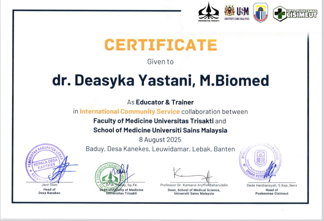 Sertifikat PKM dr. Deasyka dengan judul penyuluhan Pemeriksaan Status Kesehayan dan Penyuluhan Kesehatan Pada Anak Baduy
