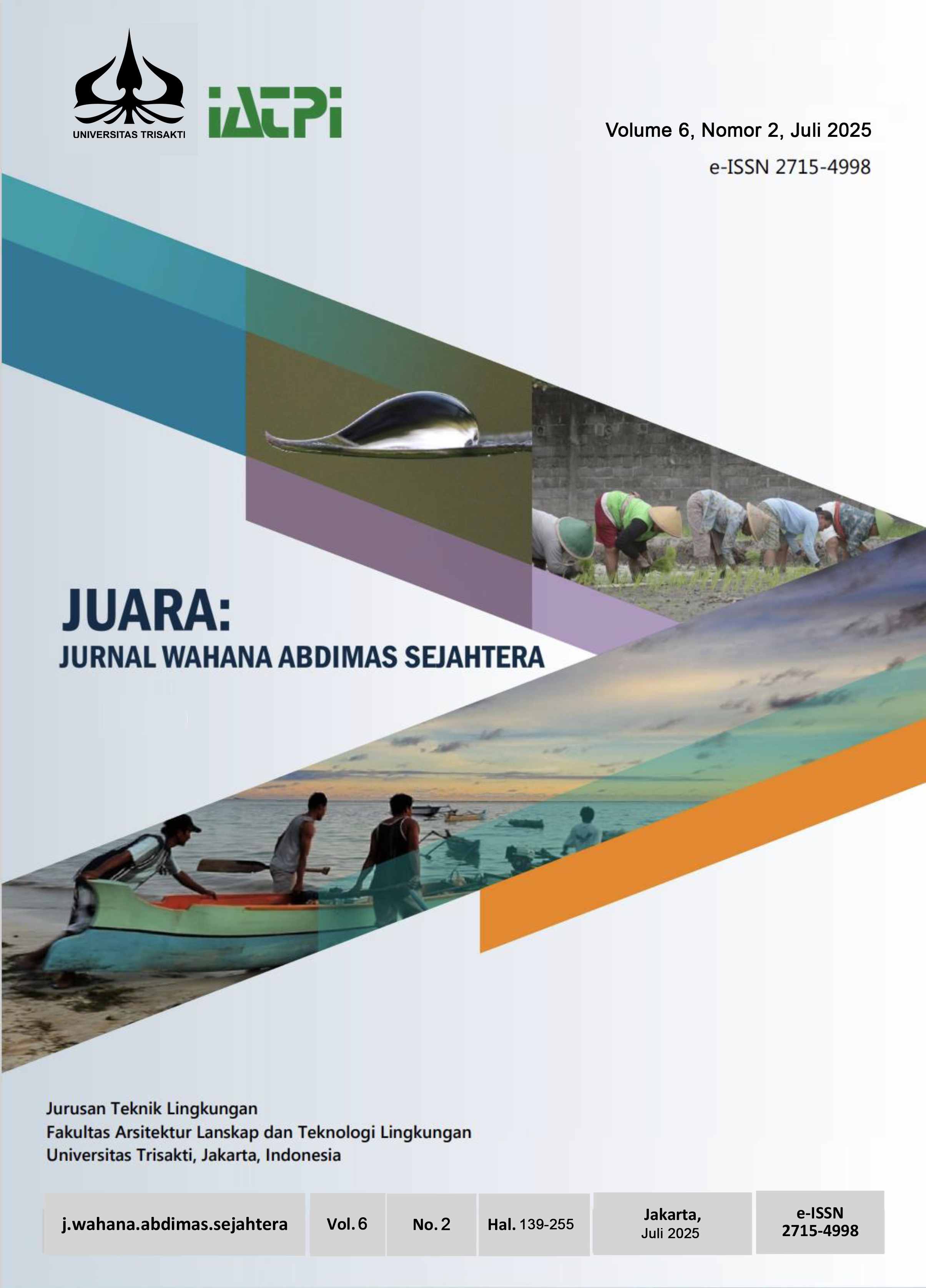 Penurunan kualitas lingkungan hidup, terutama tanah dan air, merupakan tantangan penting dalam menjaga keberlanjutan sumber daya alam. Kegiatan Pengabdian kepada Masyarakat (PkM) ini bertujuan untuk menganalisis kondisi kualitas tanah dan air di Desa Cikarawang, Kecamatan Dramaga, Kabupaten Bogor, serta memberikan rekomendasi pengelolaan lingkungan berkelanjutan kepada masyarakat. Metode yang digunakan mencakup studi literatur, pengambilan sampel tanah dan air dari lokasi representatif, pengujian laboratorium terhadap parameter kimia dan fisik, analisis data, serta kegiatan sosialisasi dan penyuluhan kepada masyarakat desa. Hasil kegiatan menunjukkan bahwa tanah di Desa Cikarawang didominasi oleh tekstur liat dengan kandungan C-organik sebesar 2,1%, N-total sebesar 0,21%, dan Kapasitas Tukar Kation (KTK) sebesar 20,84 cmol(+)/kg. Kondisi ini mendukung kesuburan tanah untuk pertanian hortikultura namun memerlukan manajemen drainase yang baik. Kualitas air menunjukkan nilai pH sebesar 6,5 dan TDS sebesar 117 mg/L, serta kadar logam berat yang rendah, sesuai dengan standar Permenkes No. 2 Tahun 2023. Air di wilayah ini layak digunakan untuk keperluan domestik, irigasi, dan sebagai sumber air baku. Implikasi dari kegiatan ini adalah pentingnya peningkatan kapasitas masyarakat dalam memahami dan menerapkan pengelolaan lingkungan berbasis data ilmiah. Hasil analisis juga menjadi dasar bagi pemerintah desa dan pemangku kepentingan untuk merancang strategi konservasi tanah dan air yang berkelanjutan di wilayah pedesaan.