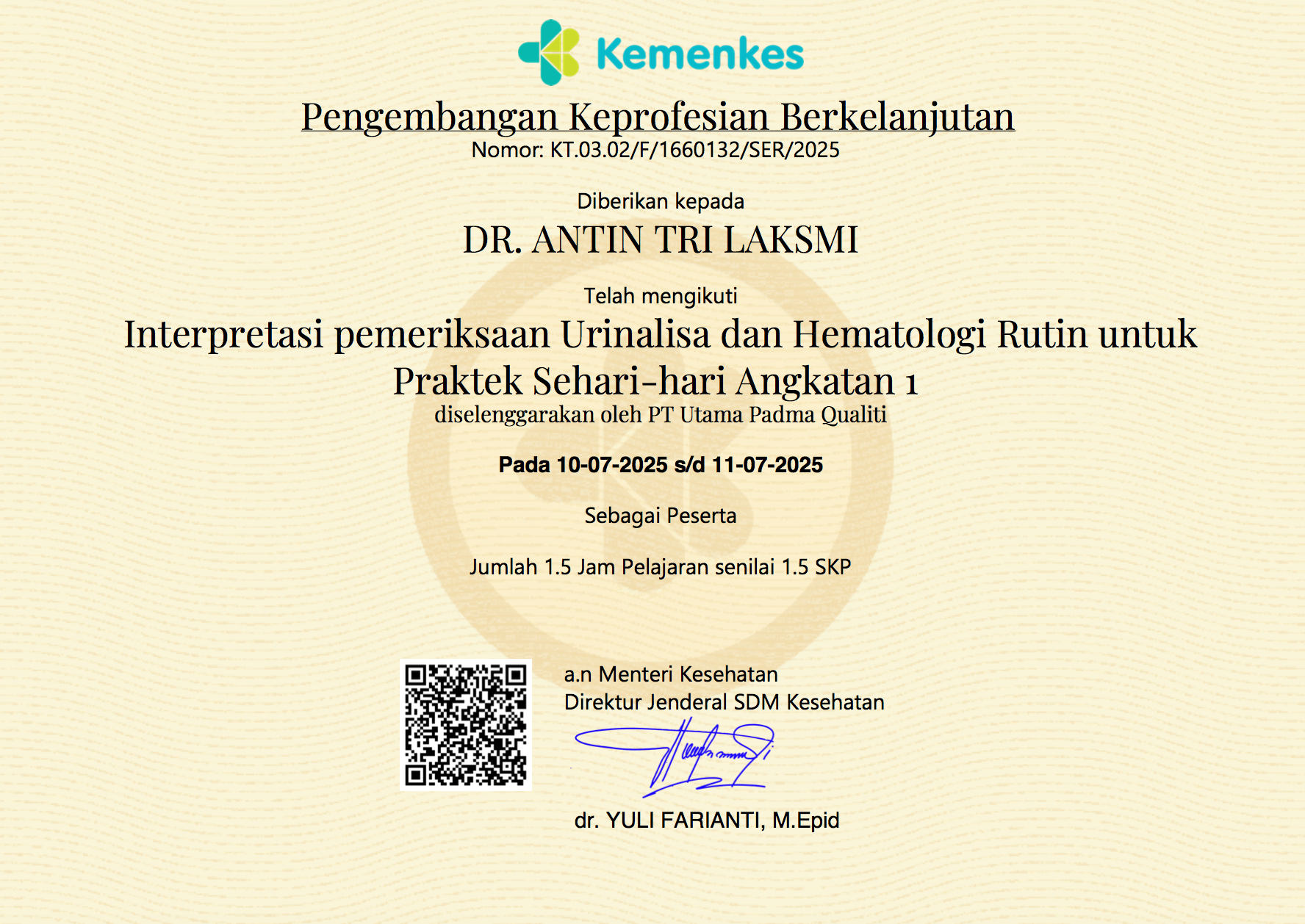 sertifikat webinar Interpretasi pemeriksaan Urinalisa dan Hematologi Rutin untuk Praktek Sehari-hari Angkatan 1
