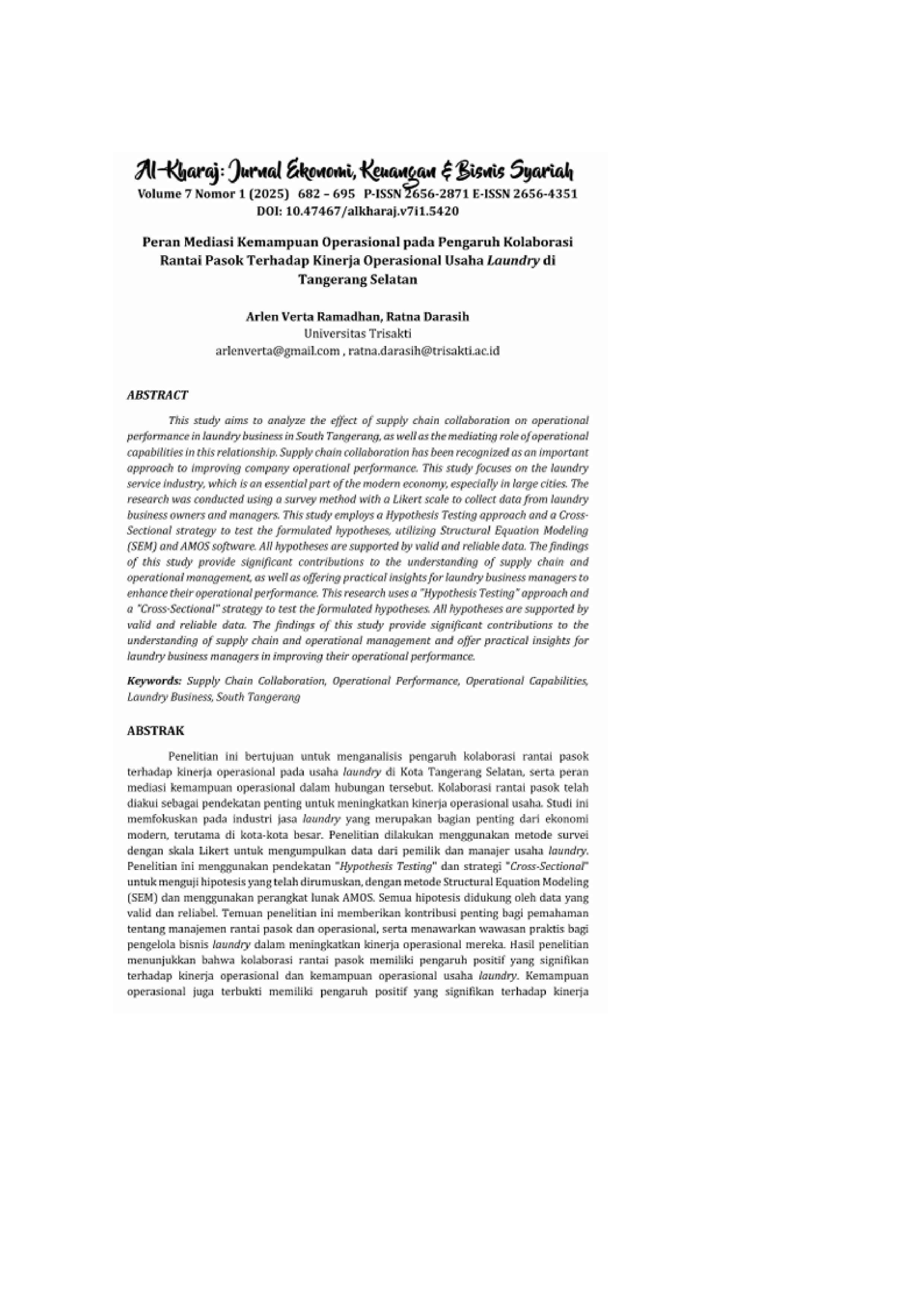 Penelitian ini menganalisis pengaruh Kolaborasi Rantai Pasok terhadap Kinerja Operasional pada usaha Laundry di kota Tangerang Selatan, serta peran mediasi Kemampuan Operasional dalam hubungan tersebut. Study ini memfokuskan pada industri jasa laundry yang merupakan bagian penting dari ekonomi modern, terutama di kota-kota besar
