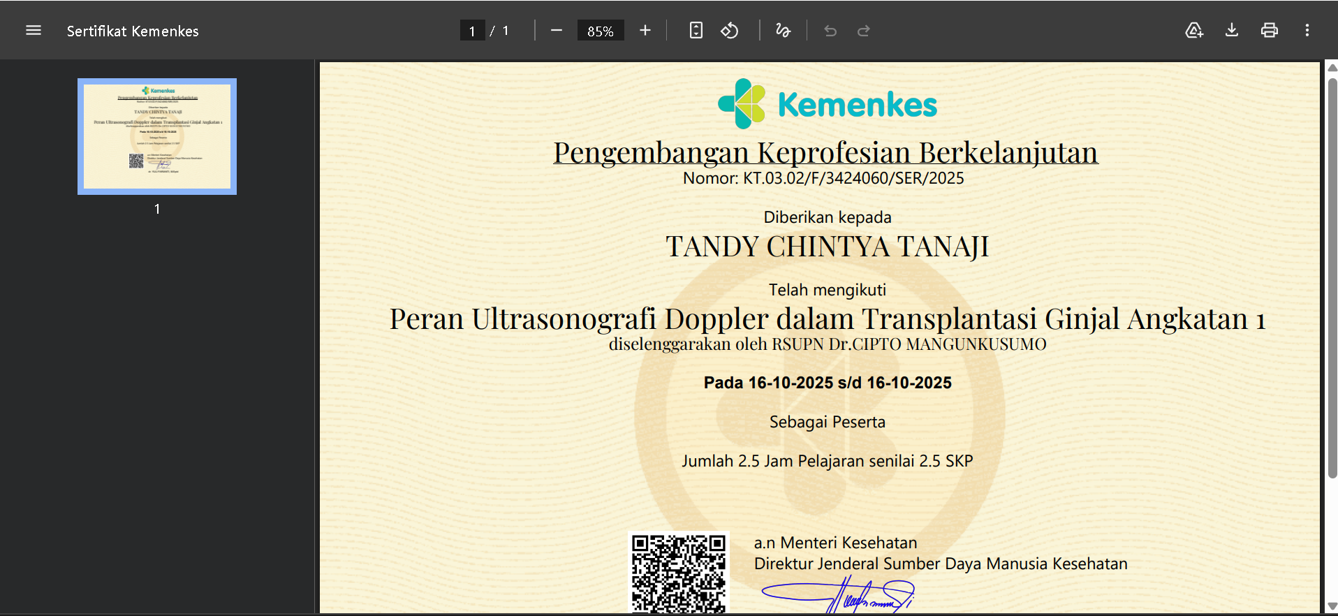 Peran Ultrasonografi Doppler dalam Transplantasi Ginjal Angkatan 1 diselenggarakan oleh RSUPN Dr.CIPTO MANGUNKUSUMO