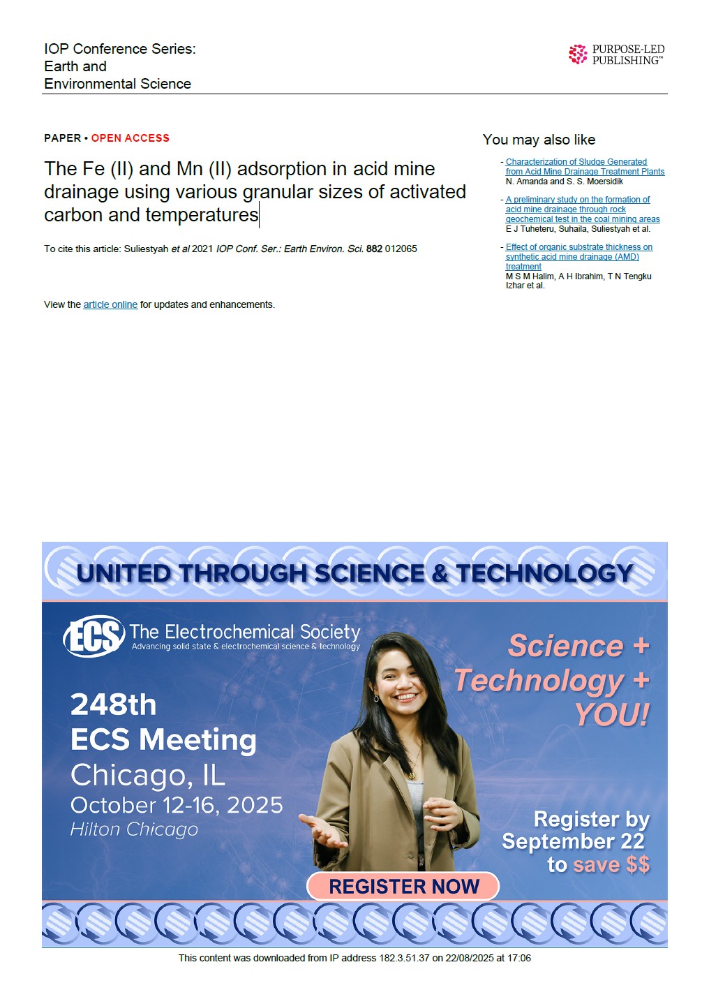 Acid mine drainage (AMD) from coal mining activities contains Fe and Mn concentrations that often exceed environmental quality requirements. This study aims to determine the effect of the coal material size and temperature on the adsorption process of Fe and Mn metals contained in AMD using activated carbon made with a composition of 60% coal and 40% ZnCl2. For characterizing activated carbon, surface morphological was analyzed using SEM method, and surface area was analyzed using BET method. Meanwhile,