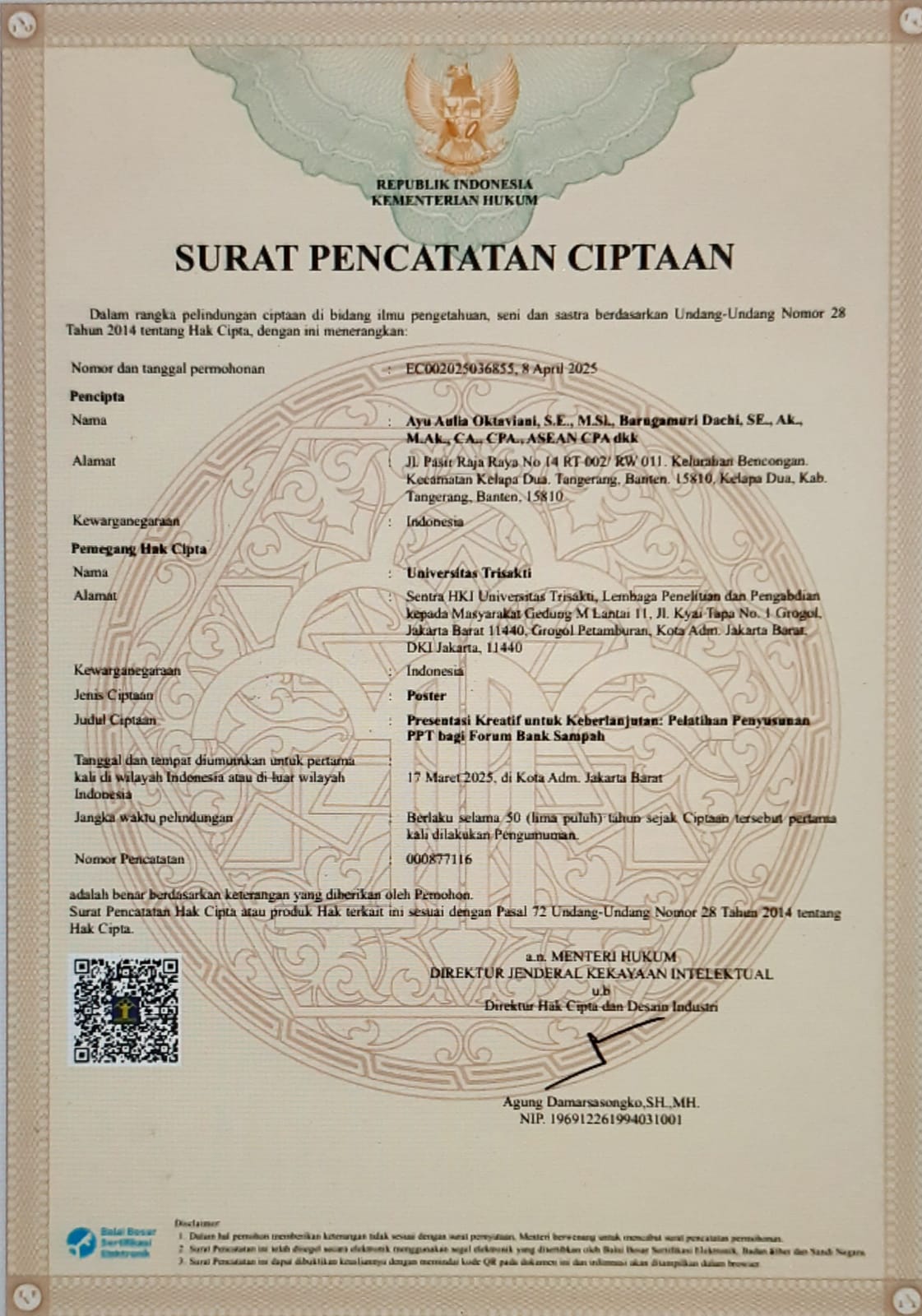 HKI berupa poster yang berjudul Presentasi Kreatif untuk Keberlanjutan: Pelatihan Penyusunan PPT bagi Forum Bank Sampah