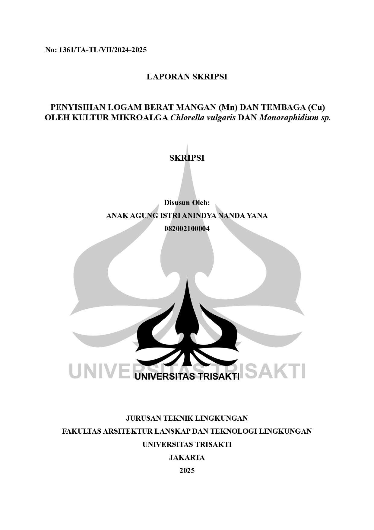 BERITA ACARA MENGUJI PENYISIHAN LOGAM BERAT MANGAN (Mn) DAN TEMBAGA (Cu) OLEH KULTUR MIKROALGA Chlorella vulgaris DAN Monoraphidium sp. (ANAK AGUNG ISTRI ANINDYA NANDA YANA)