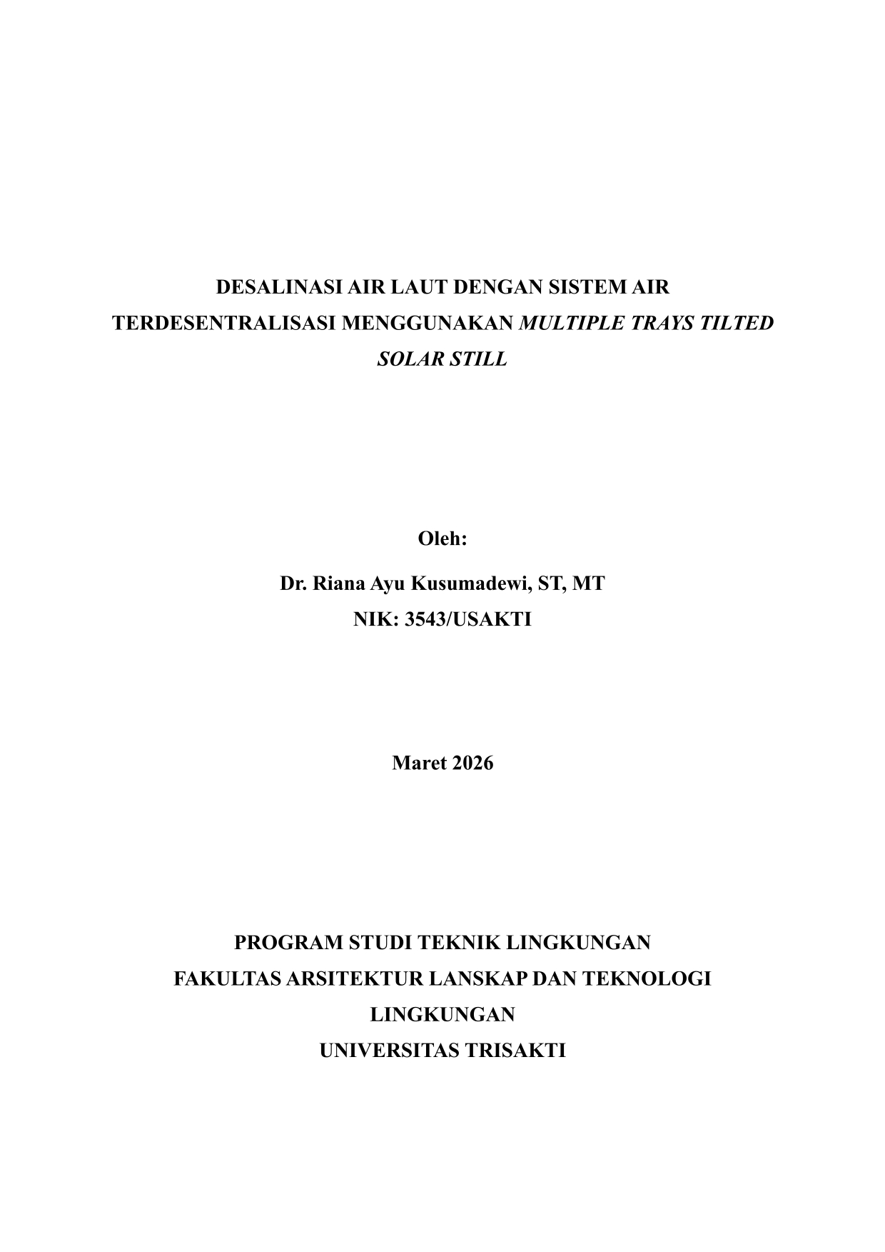 Makalah ini merupakan suatu kajian dalam bidang pengolahan air laut menjadi air bersih yang bertujuan untuk memperoleh gambaran yang jelas dan terukur mengenai kinerja dari multiple trays tilted solar still yang digunakan pada skala pilot dengan meninjau kuantitas dan kualitas air umpan, air distilat yang dihasilkan, dan brine sisa proses desalinasi. Selain itu, pada makalah ini juga dibahas mengenai estimasi biaya yang harus dikeluarkan untuk membuat alat desalinasi seluas 0,8 m2.